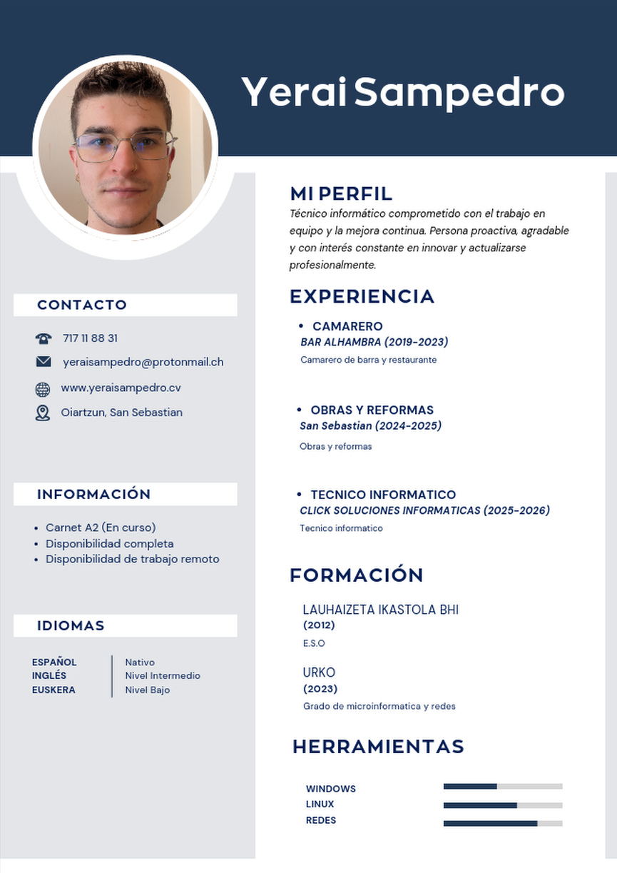 Soy Yerai Sampedro, tengo 24 años y desde siempre me han apasionado los ordenadores y la informática en general. Desde entonces, he dedicado mucho tiempo a aprender más sobre este campo. Me gradue en el Grado de Informática, pero en mi tiempo libre sigo actualizándome constantemente con las nuevas tecnologías y avances del sector. La parte que más me atrae de la informática son las redes y los sistemas, aunque también disfruto trabajando en otras áreas.